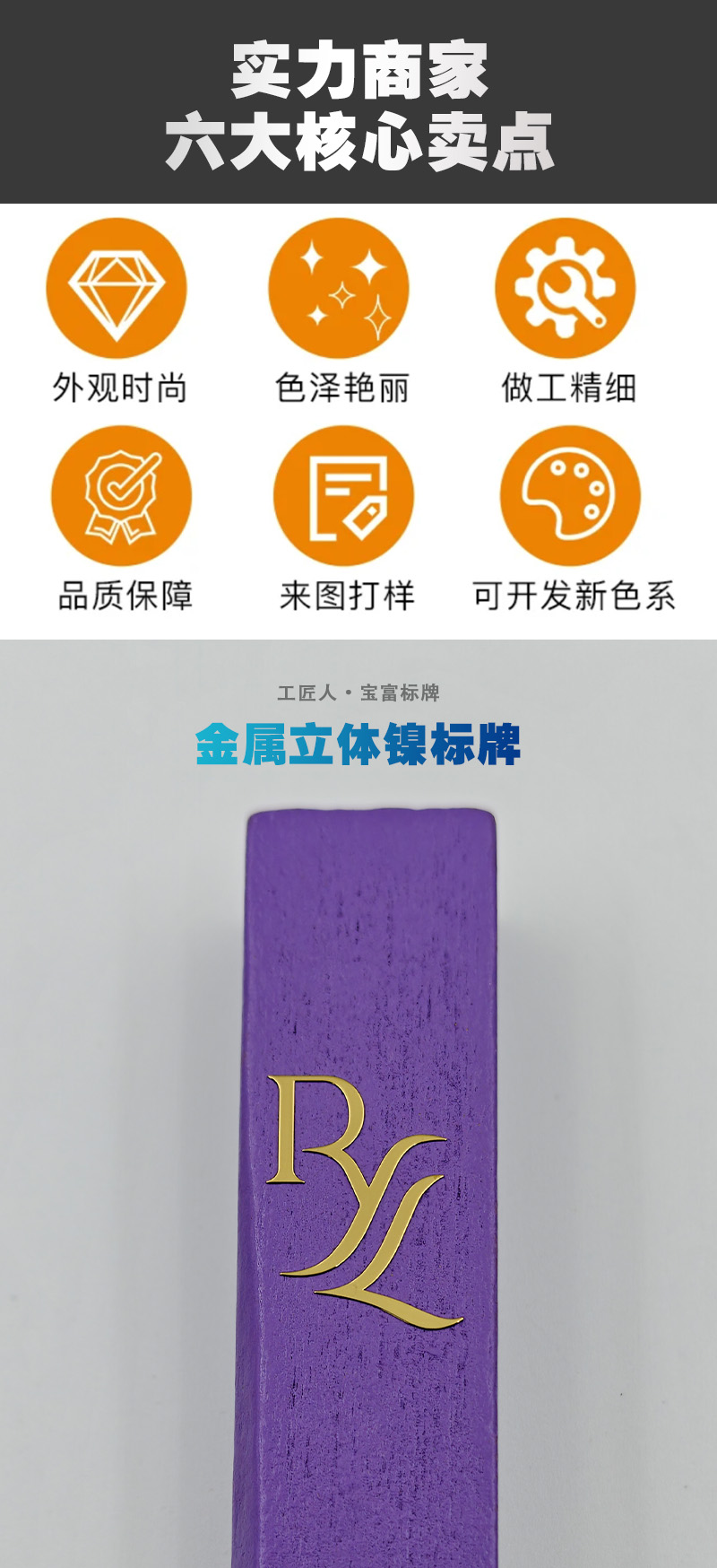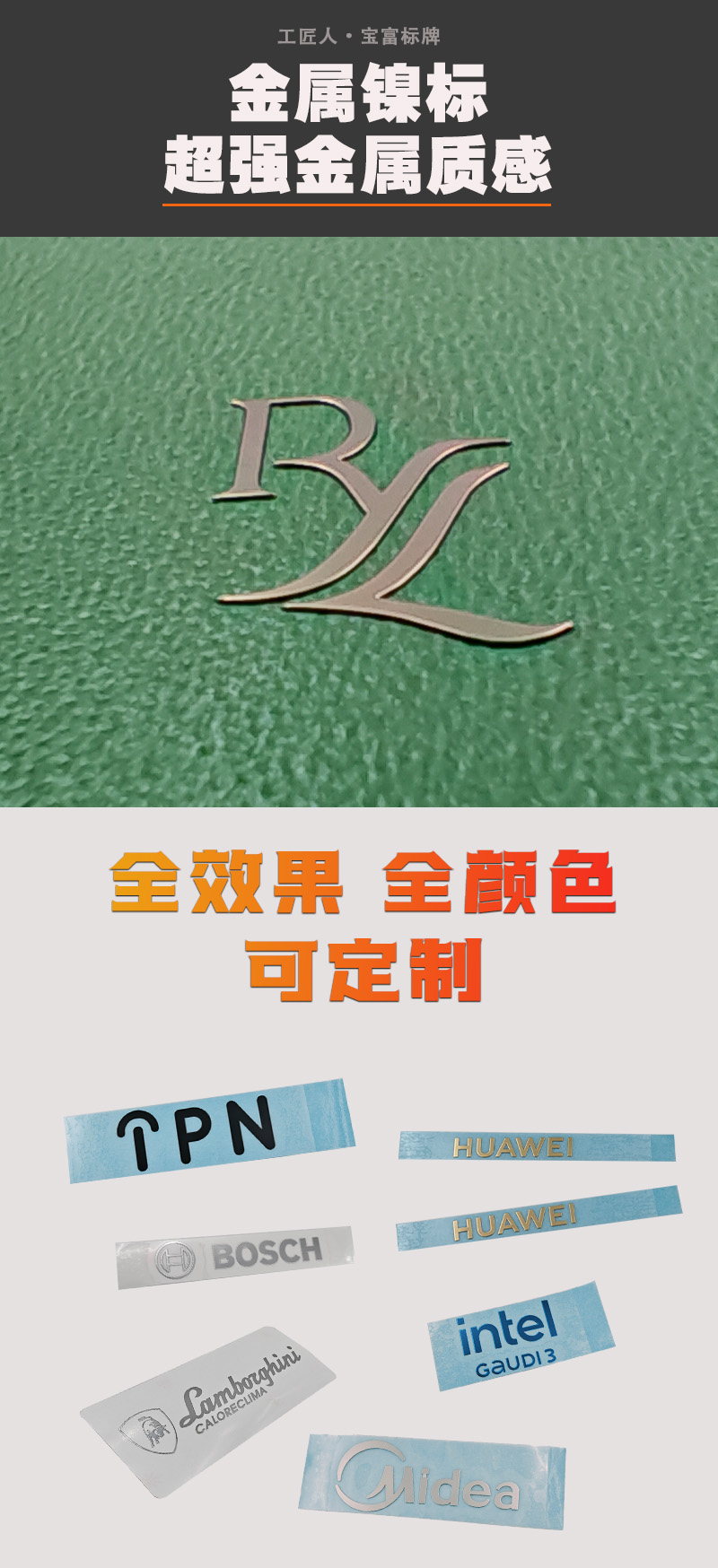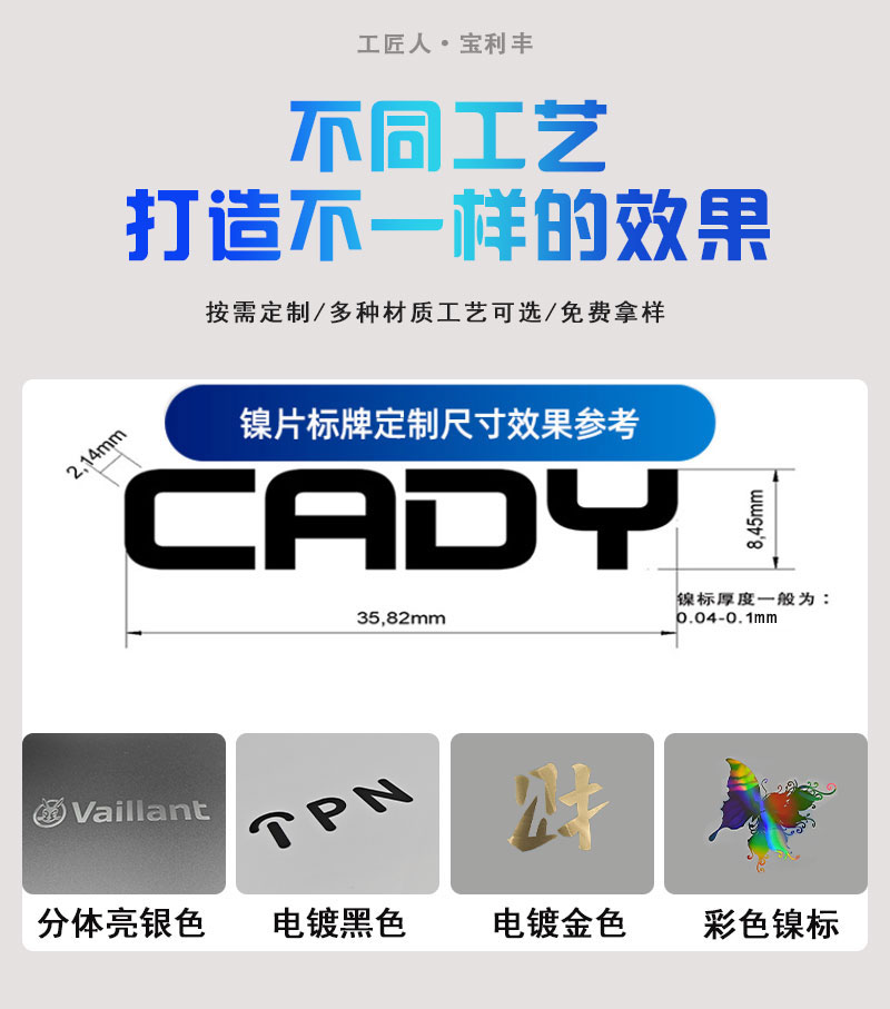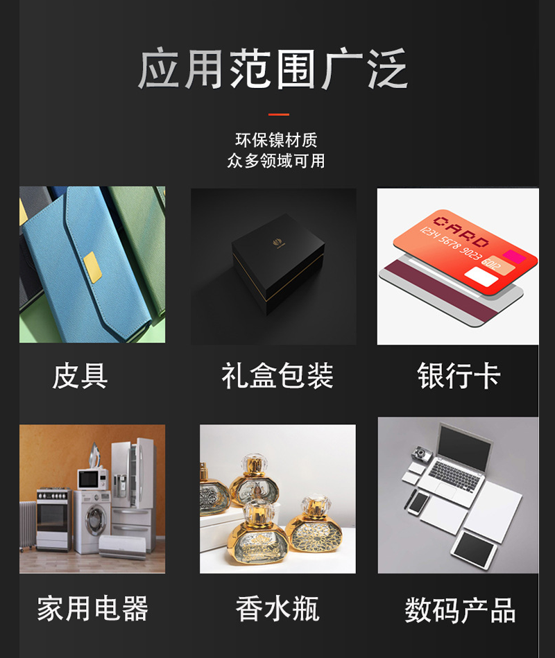 电铸金属镍标牌适用于3C数码产品、电子产品、家电家具、皮革包包、包装行业、汽车行业、酒包装、香水行业、包装礼盒等,应用领域非常广泛,欢迎有需要的老板咨询我们。