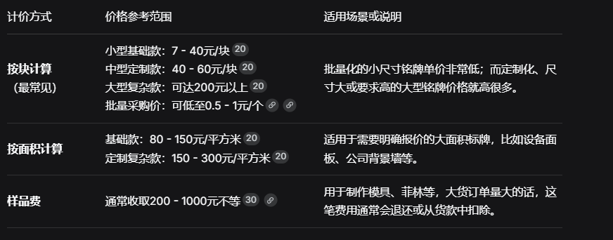 简单的道理:尺寸越大,材料和加工成本越高。同时,异形或非常规形状的铭牌可能需要额外的模具费或冲切工序,也会推高价格。